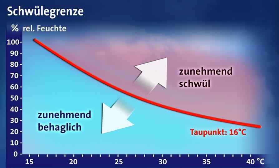 Abbildung 2: Als ein Grenzwert, ab dem Schwüle beginnt, wird ein Taupunkt von 16 °C angenommen, was unter Normalbedingungen einer absoluten Luftfeuchtigkeit von 13,5 g Wasserdampf pro Kubikmeter Luft entspricht. Bedeutsam ist die Schwüle in unseren Breiten etwa von April bis Oktober. Bildquelle hr-Fernsehen.de, Sendung vom 20.07.2020