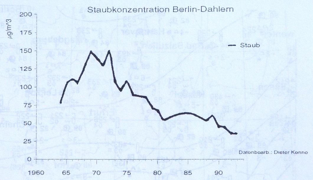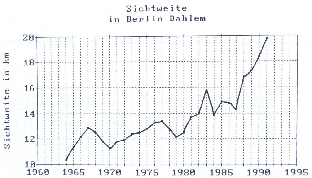 Abbildungen 5a und 5b: Nach dem Höhepunkt der Staubbelastung um 1970 nahm diese in Berlin-Dahlem stark ab; Jahresmittel in Mikrogramm je m³ Luft (oben, 5a). Nach 1970 stieg am selben Ort die Sichtweite in Km (Jahresmittel) stark an; besonders ab dem Ende der 1980er Jahre (unten, 5b). Leider enden diese Beobachtungen in den 1990er Jahren; doch dürften seitdem der Staubgehalt noch weiter ab- und die Sichtweite weiter zugenommen haben. Bildquellen (3)