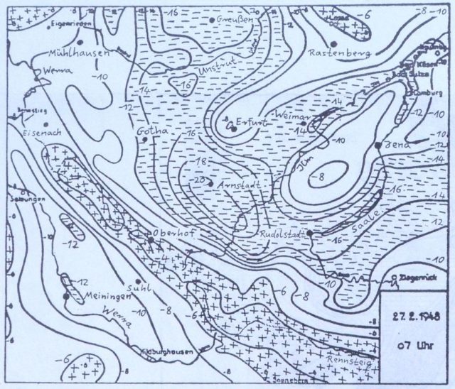 Abbildung 6: Am Spätwintermorgen des 27. Februars 1948 herrschten in Thüringen enorme, höhenbedingte Temperaturunterschiede durch Inversion. Mit „+“ sind alle Gebiete über minus 6, mit „–„ solche unter minus 12°C gekennzeichnet. Während auf dem Rennsteig (Oberhof) nur etwa minus 4°C gemessen wurden, waren es in der Senke bei Arnstadt unter minus 20°C – das ist eine Temperaturdifferenz von mehr als 16 Kelvin auf kaum mehr als 600 Meter Höhendifferenz; räumlich sind beide Orte kaum 20 Km Luftlinie voneinander entfernt. Das Temperaturminimum von unter minus 20°C würde der Luftmasse cA entsprechen – aber es entstand nur durch nächtliche Ausstrahlung bei klarem Himmel in einer kontinentalen Subpolarluft und wurde bald von der Vorfrühlingssonne weggeheizt – nachmittags herrschte in Arnstadt leichtes Tauwetter. Bildquelle (4), ergänzt.