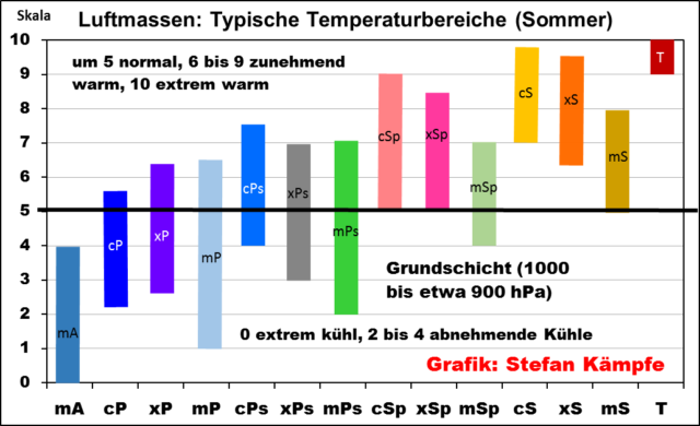 Dieses Einzelbeispiel verdeutlicht die Schwierigkeit, jeder Luftmasse in der Grundschicht, in welcher wir ja nun mal leben und auch die DWD-Temperaturen für die „normalen“ Wetterberichte gemessen werden, einen Temperaturbereich zuzuweisen. Denn Sonnenscheindauer, Exposition, Hanglage, Oberflächenbeschaffenheit, Bewuchs oder Bebauung beeinflussen die bodennahen Temperaturverhältnisse stark. Hinzu kommen die Jahreszeiten; manche Luftmassen zeigen im Winter ein gänzlich anderes Temperaturverhalten, als im Sommer. Außerdem verfälschen Stau und Föhn die Luftmasseneigenschaften oft stark; Näheres unter (6) und (7).