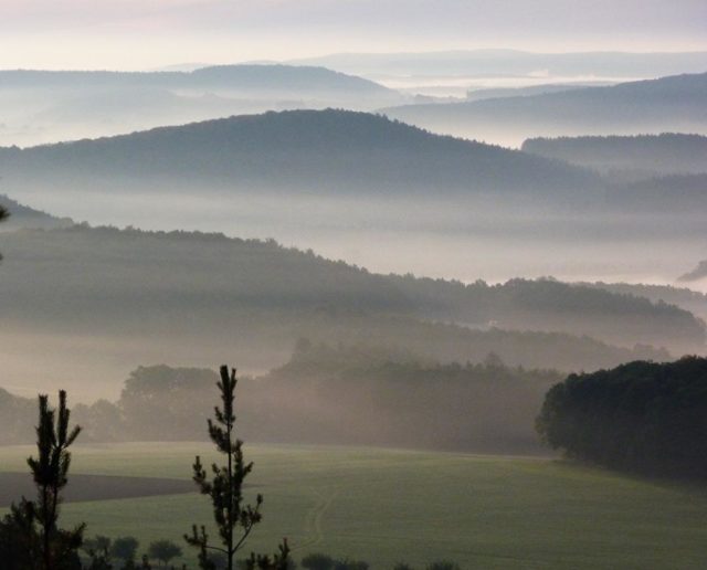 Kontinental gealterte Warmluft (cSp) im Herbst unter Hochdruckeinfluss. Morgendliche, meist flache Dunst- und Nebelfelder verschwinden auch in der kälteren Jahreszeit abseits der Flusstäler stets tagsüber; dann kann in dieser trockenen, fast immer sonnigen Luftmasse eine mitunter gute Fernsicht herrschen. Foto: Stefan Kämpfe