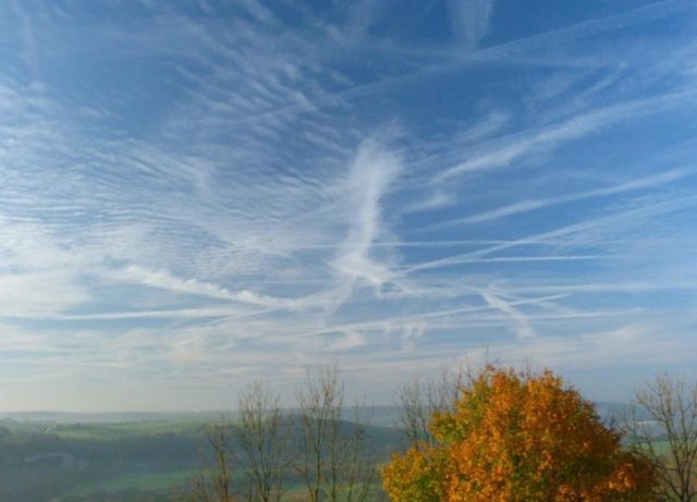 Subtropikluft (xS) in einem Warmsektor. Mehr oder weniger dichte Cirrus-Felder, oft durch den Luftverkehr verstärkt, dazu Altocumuli bei deutlichem Ferndunst. Foto: Stefan Kämpfe