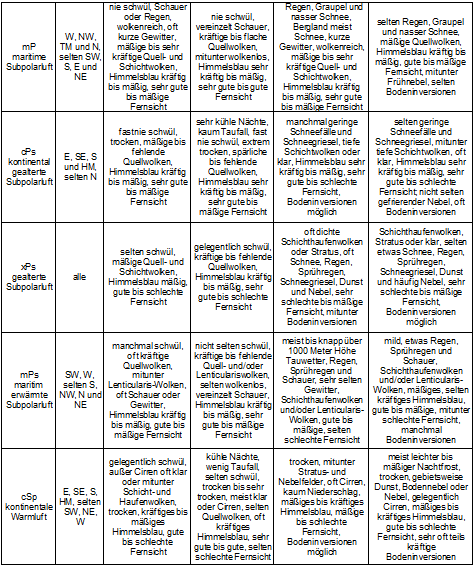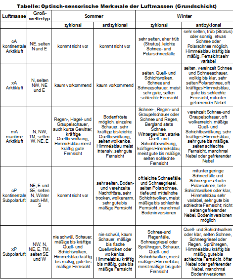 So kann die Luftmasse mP an einem windigen, trüben, regnerischen Sommertag nur Temperaturmaxima von 10 bis kaum 15°C (Flachland) erreichen; während bei voller Sonne und schwachem Wind angenehme 20 bis 23°C, ganz selten sogar fast 25°C, möglich sind. Und in klaren, windstillen Winternächten kann sich cP über einer Schneedecke auf unter minus 20°C abkühlen, während in trüben, windigen Nächten nur Werte um oder etwas unter minus 5°C möglich sind. Die folgende Tabelle zeigt weitere, wesentliche Luftmassen-Merkmale: