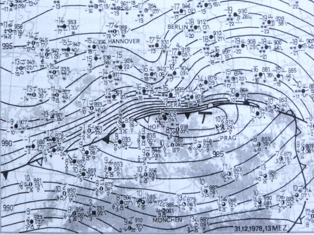 Abbildungen 1a und 1b: In der oberen Abbildung (1a) erkennt man in der Höhenwetterkarte für 850 hPa vom 31.12.1978, 1 Uhr, eine markante Warmfront genau über der Mitte Deutschlands; sie trennt die extrem kalte Luftmasse cA von der sehr milden mPs. Unten (1b) die Bodenwetterkarte selbigen Datums um 13 Uhr. Während in Norddeutschland eisige minus 17 bis minus 19°C herrschten, war es am Alpennordrand mit 10 bis 13°C frühlingshaft mild. Aber genau in der Mitte Deutschlands konnte für diesen denkwürdigen Silvestertag keine Luftmasse klassifiziert werden – hier lag die Luftmassengrenze und bewegte sich in der ersten Tageshälfte als Warmfront nordwärts; ab etwa Mittag als Kaltfront südwärts. Eine derart extreme Wetterlage ist nach 1979 nie wieder aufgetreten – obwohl doch Extremwetter in Zeiten des Klimawandels angeblich immer häufiger werden soll. Bildquelle: Berliner Wetterkarte vom 31.12.1978 des Instituts für Meteorologie der Freien Universität Berlin