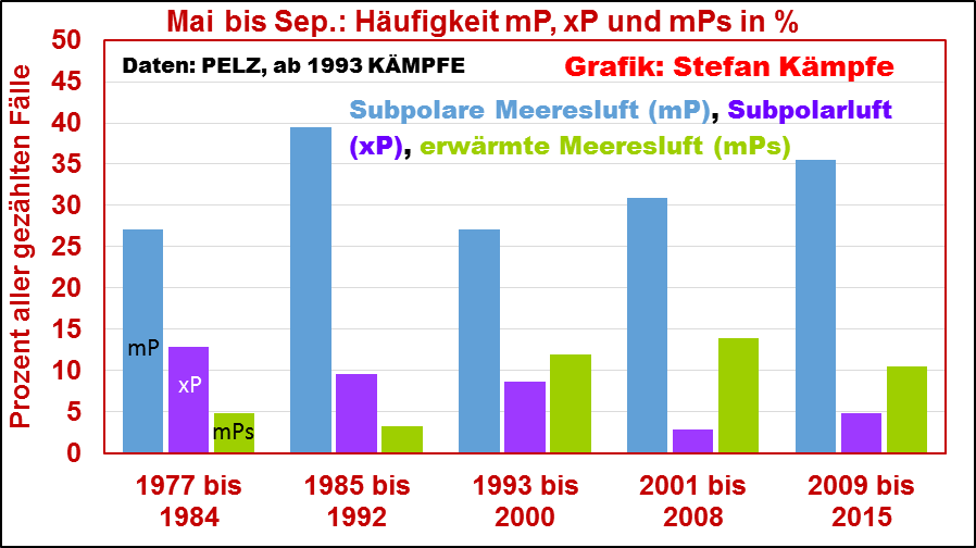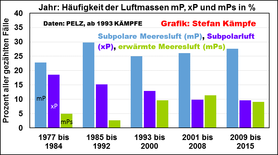 Abbildung 8: Man achte auf die große Häufigkeit der Luftmasse mP in der warmen Jahreszeit (Mai bis September), die fast unverändert blieb. Wieder leicht gegenläufige Entwicklung bei mPs und xP.