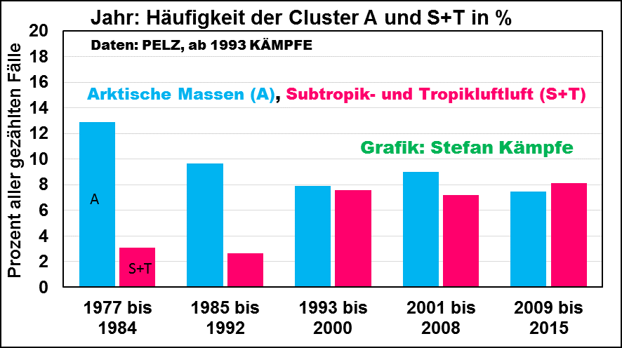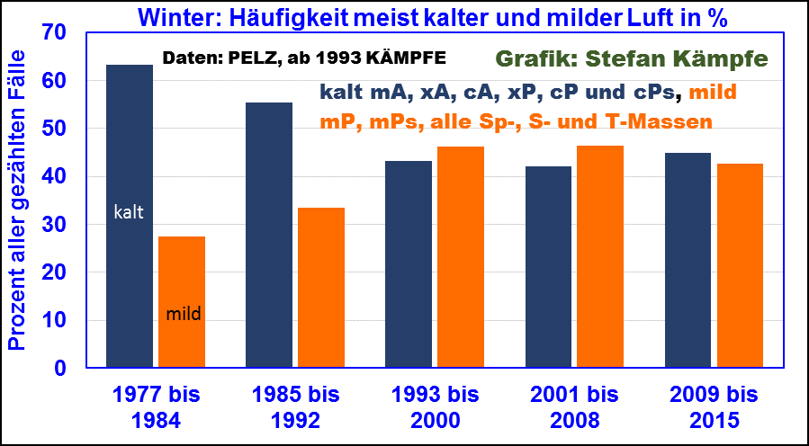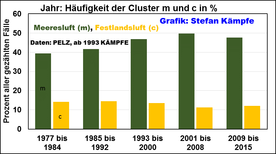Diese winterliche Stagnation nach spätestens 1990 zeigt sich auch bei den im Winter meist zu milden und zu kalten Luftmassenclustern: