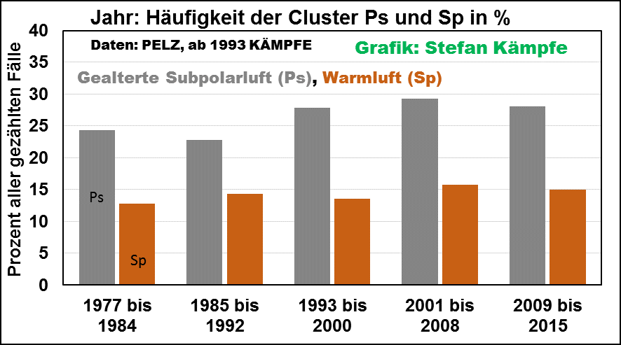 Abbildung 5: Ps- und Sp-Massen, die nicht selten in Mitteleuropa entstehen, wurden tendenziell etwas häufiger, wohl auch, weil es mehr unbestimmte Wetterlagen gibt.