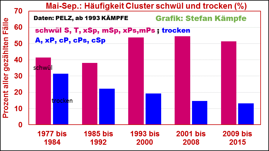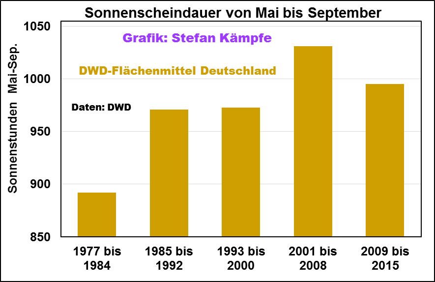 Nun stellt sich die Frage nach den Ursachen dieser Häufigkeitsentwicklung. Die Neubildung oder aber die Umwandlung einer Luftmasse wird sehr stark von der Sonneneinstrahlung beeinflusst; je länger und intensiver die Sonne scheint, desto schneller wandeln sich kalte in erwärmte (Ps)- und weiter in warme (Sp)-Massen um; und sehr warme S- und T-Massen werden dann ihren Charakter eher beibehalten. Es lag also nahe, einmal die Entwicklung der Sonnenscheindauer (DWD-Flächenmittel) in den entsprechenden Zeitintervallen zu prüfen. Weil die Sonne von Mai bis September am stärksten wärmt, genügt es, diesen Zeitraum zu zeigen; die Entwicklung im Jahresmittel verlief ähnlich: