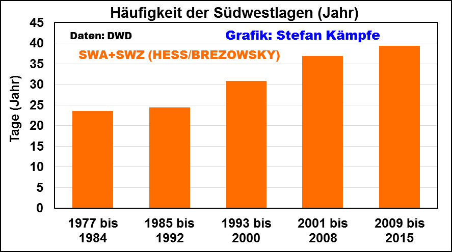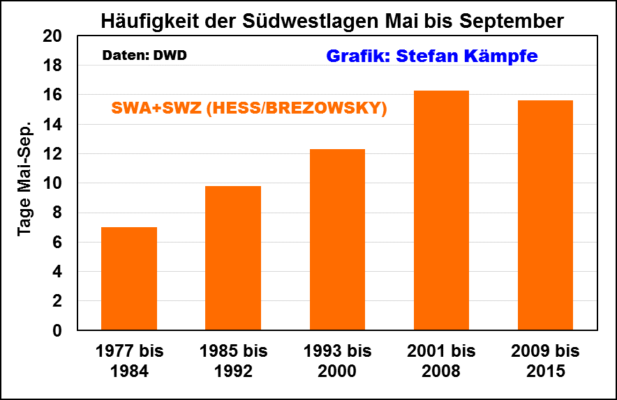 Eine weitere Ursache der Häufung warmer Luftmassen war die Häufigkeitszunahme bestimmter Großwetterlagen; besonders der Südwestlagen. Diese zeigte sich sowohl im Jahresmittel, vor allem sprunghaft aber im Zeitraum von Mai bis September: