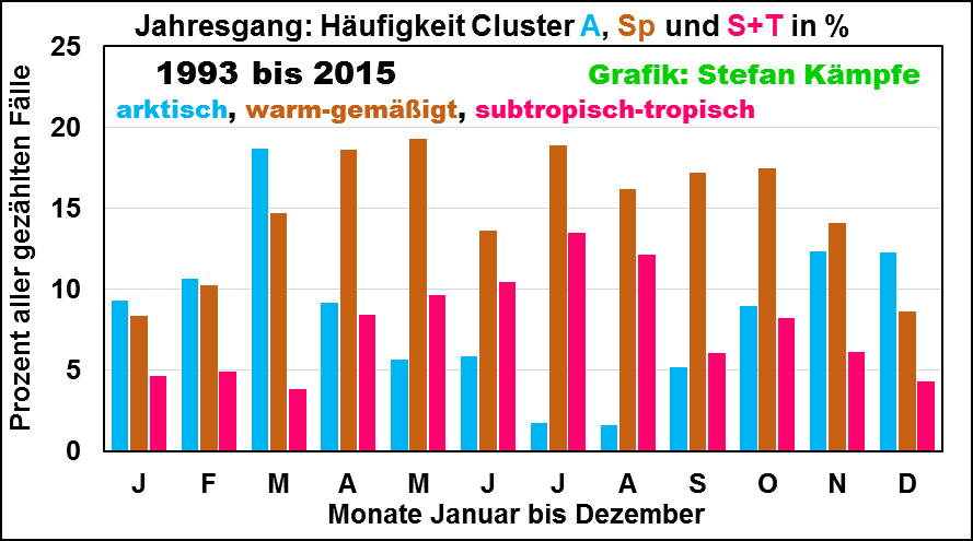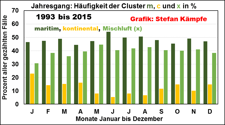 Es sei nur der Form halber auf die momentane AMO-Warmphase als Hauptursache der gehäuften Süd- und Südwestlagen verwiesen; Näheres dazu hier. Abschließend soll noch das Häufigkeitsverhalten wichtiger Luftmassen und Luftmassencluster im Jahresverlauf anhand der Daten von 1993 bis 2015 gezeigt werden: