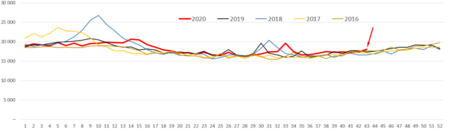 Bild 16 Schweden Sterbezahlen (Jahr 2020: 01.01. – 12. Nov. Quelle. SCB Number of deaths reported to Statistics Sweden, per day for 2015-2020 (entire country). Abgerufen 23.11.2020