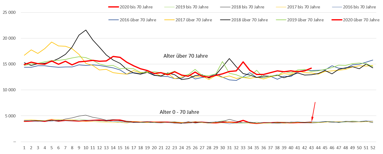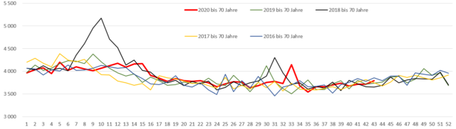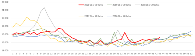 Bild 4 Deutschland, Sterbefallzahlen Einwohner über 70 Jahre, Jahreswerte einzeln. Grafik vom Autor erstellt. Quelle Destatis. Abgerufen: 23.11.2020