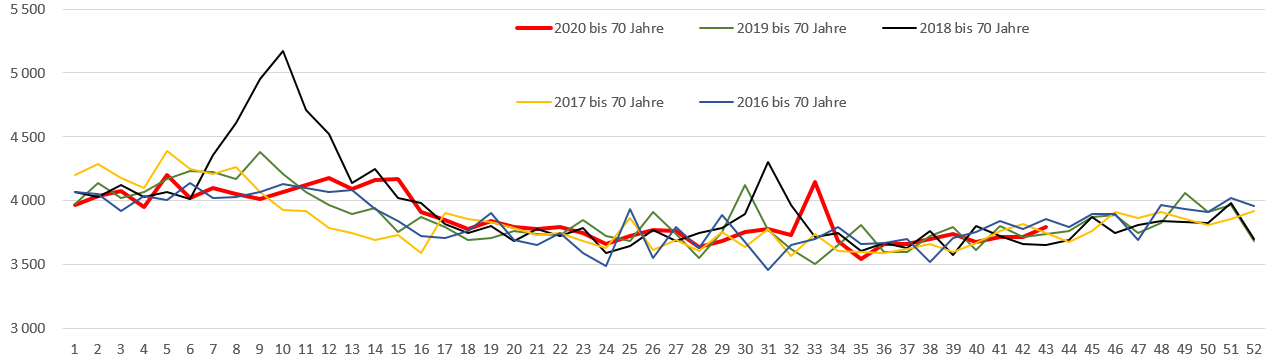Bild 3 Deutschland, Sterbefallzahlen Einwohner bis 70 Jahre, Jahreswerte einzeln. Grafik vom Autor erstellt. Quelle Destatis. Abgerufen: 23.11.2020