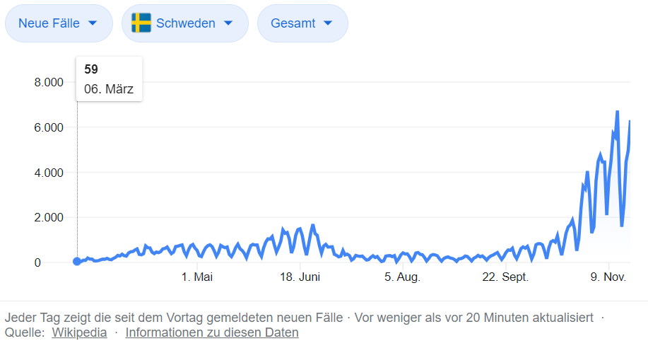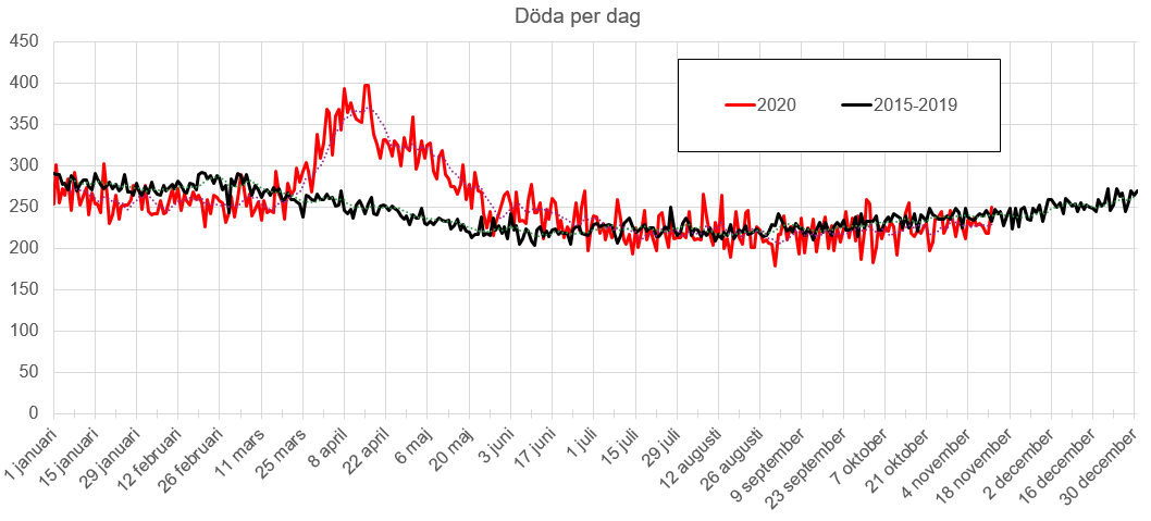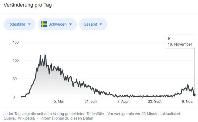 Bis zum 15.04.2020 waren in Schweden 27644 Menschen gestorben. Wenn man nach dem Verlauf bis zum 15.04.2020 gerechnet hätte, dann wären 73720 Menschen in einem Jahr gestorben und das deutlich weniger als zum Vorjahr 2019 mit 94945 Toten. Wenn es aber eine Übersterblichkeit Mitte April gäbe, dann hätte man deutlich mehr Tote für das Jahr 2020 ausrechnen müssen.