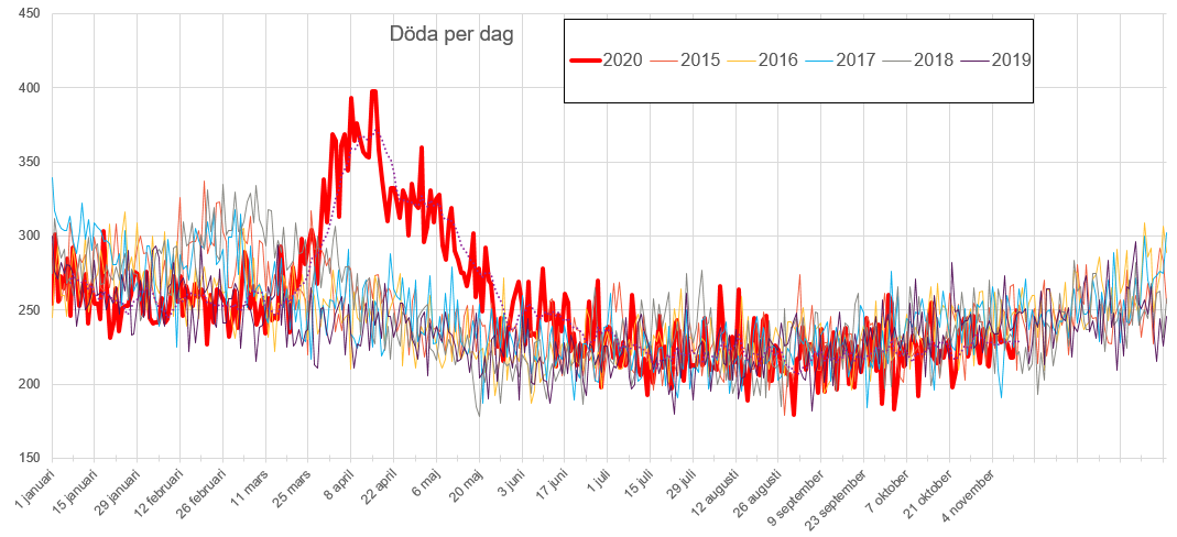 Bild 17 Schweden Sterbezahlen Einzeljahre (Jahr 2020: 01.01. – 12. Nov. Quelle. SCB Number of deaths reported to Statistics Sweden, per day for 2015-20201 (entire country). Abgerufen 23.11.2020