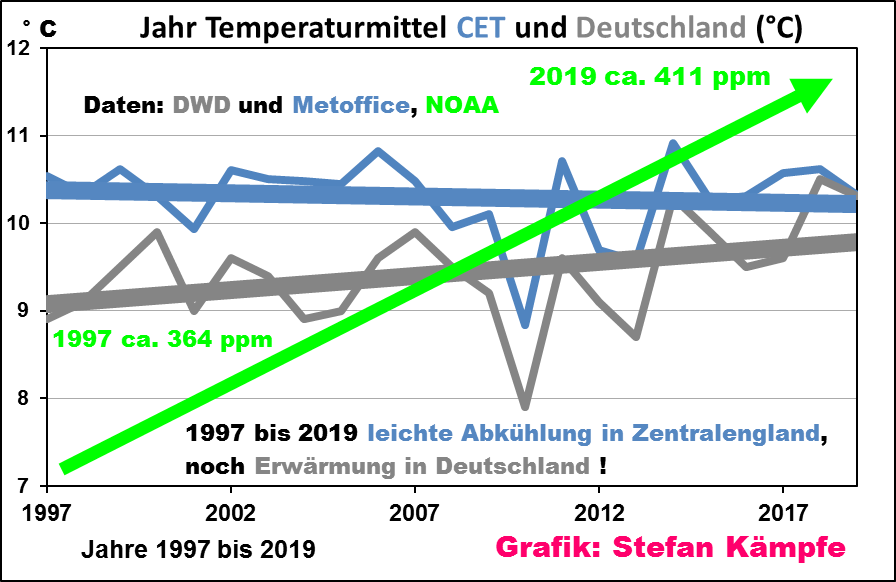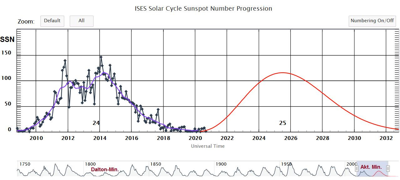 In den kommenden Jahrzehnten sinkt die Sonnenaktivität aber vermutlich weiter (neues Dalton- oder Maunder-Minimum), was weltweit abkühlend wirkt und in Mitteleuropa Meridionale Lagen (im Winter oft kalt) begünstigt. Das träge Klimasystem reagiert nur mit Verzögerungen von etwa 10 bis 30 Jahren auf die schon nach 1990 beginnende tendenzielle Abschwächung der Sonnenaktivität, so dass sich negative Auswirkungen erst ab den 2020er Jahren deutlicher zeigen werden. Vermutlich gab es deswegen bereits in den letzten 23 Jahren zwar noch eine Erwärmung in Deutschland; in Zentralengland kühlte es sich dagegen trotz der stark steigenden CO2-Konzentrationen schon leicht ab: