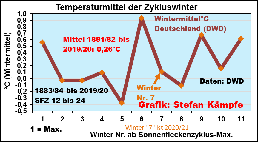Das Minimum zwischen den Zyklen 24 und 25 trat also zwischen Herbst 2019 und Frühherbst 2020 ein und zog sich damit sehr lange hin. Das solare Verhalten ähnelt damit dem des DALTON-Minimums im frühen 19. Jahrhundert; einer Kaltphase, die aber auch durch eine ungewöhnlich hohe vulkanische Tätigkeit begünstigt wurde (u.a. Tambora-Ausbruch). Der Winter 2020/21 ist der siebente nach dem Maximum des SCHWABE-Zyklus. Die 12 Vergleichswinter seit 1881/82 liegen mit etwa +0,1°C etwas unter dem Wintermittel des gesamten Zeitraumes 1881/82 bis 2019/20, das etwa 0,3°C beträgt. Von diesen 12 Vergleichswintern waren die von 1889/90, 1899/1900, 1923/24, 1953/54, 1985/86 und 1995/96 deutlich, aber nicht herausragend, zu kalt, zwei Winter waren etwa normal, vier zu mild, darunter 1974/75 und 2007/08 extrem mild. Betrachtet man alle Winter nach ihrem Rang im SCHWABE-Zyklus, so verliefen der sechste und der neunte nach dem Zyklus-Maximum im DWD-Deutschlandmittel am mildesten; freilich ist der „Vorhersagewert“ wegen des geringen Stichprobenumfangs mit Vorsicht zu genießen:
