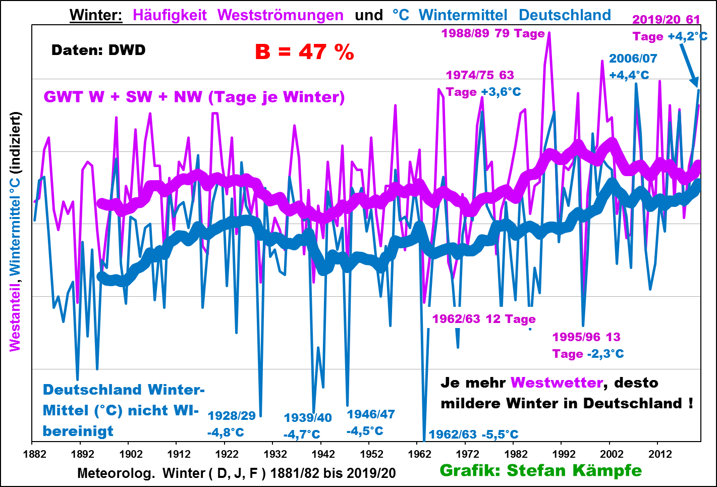 Westliche Luftströmungen (Zonale Großwetterlagen) bringen milde Atlantikluft nach Deutschland, nördliche und vor allem östliche Kaltluft. Bei Süd- und Zentralhochlagen muss ein starker Wind die bodennah aus Ost einsickernde oder vor Ort immer wieder neu entstehende Kaltluftschicht vertreiben, ansonsten können auch sie im Tiefland bitterkalt sein, während es auf den Berggipfeln sehr mild ist. Der Zusammenhang zwischen der Häufigkeit der Luftströmungen mit Westanteil (Großwettertypen W, SW und NW) sowie den Wintertemperaturen in Deutschland ist sehr eng (folgende Grafik):