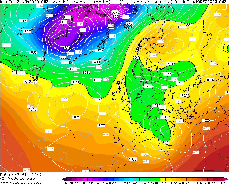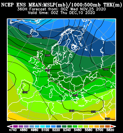 Die verbesserte Kurzfrist-Vorhersagegüte (etwa 1 bis 4 Tage im Voraus) resultierte aus der Entwicklung und Verfeinerung numerischer Modelle, basierend auf Gleichungen der Thermodynamik, in Verbindung mit immer schnelleren Computern sowie mehr und besseren Mess- oder Beobachtungsdaten per Satelliten und Automaten. Für längerfristige Vorhersagen dienen sogenannte Ensemble-Modelle, bei denen man die Ergebnisse mehrerer Modell-Läufe (gerechnet mit leicht variierten Anfangsparametern) mittelt. Sie liefern keine detaillierten Vorhersagen, doch gute Abschätzungen der Luftdruckverhältnisse für etwa eine Woche im Voraus und vage für bis zu 15 Tagen. Die Ensemble-Vorhersagekarte des NOAA (USA- Wetterdienst) vom 25.11. für den 10.12.2020 zeigt tiefen Luftdruck von Island zum Eismeer, hohen Luftdruck über Iberien und westlich davon. Interessant ist der tiefe Luftdruck im östlichen Mittelmeer; er könnte die Westdrift schwächen (Quelle: NOAA). Sollte das so eintreten (noch sehr unsicher), so würde über Mitteleuropa eine mäßige, eher milde Westströmung herrschen, nach tiefem Winter sieht das zwar nicht aus, aber zumindest zeitweise könnte subpolare Meeresluft für Flockenwirbel im Bergland und vielleicht gar für nassen Schnee und häufigere Nachtfröste im Tiefland sorgen: