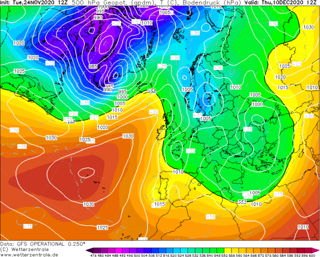 Allerdings zeigten die einzelnen Modell-Läufe des GFS, es gibt deren je 30 für jeden Startzeitpunkt, seit etwa dem 20.11. vermehrt Fälle, in denen zumindest zeitweise entweder hoher Luftdruck über dem nördlichen Mitteleuropa und Skandinavien herrschen soll, oder es zu einer mehr oder weniger deutlichen Troglage über Mitteleuropa und dem Mittelmeer kommt; Beides eröffnet Chancen für zumindest teilweise winterliche Verhältnisse; hier zwei Beispiele (Quelle):