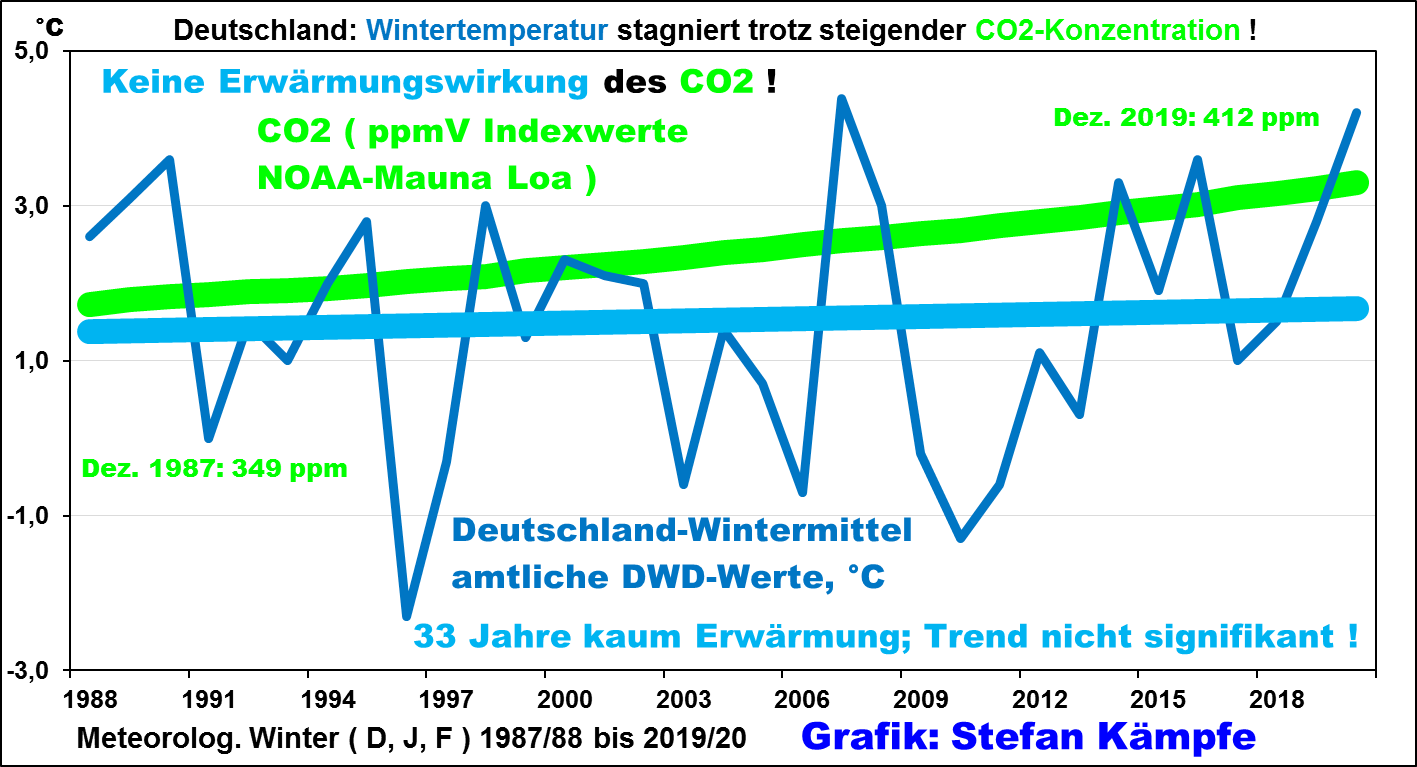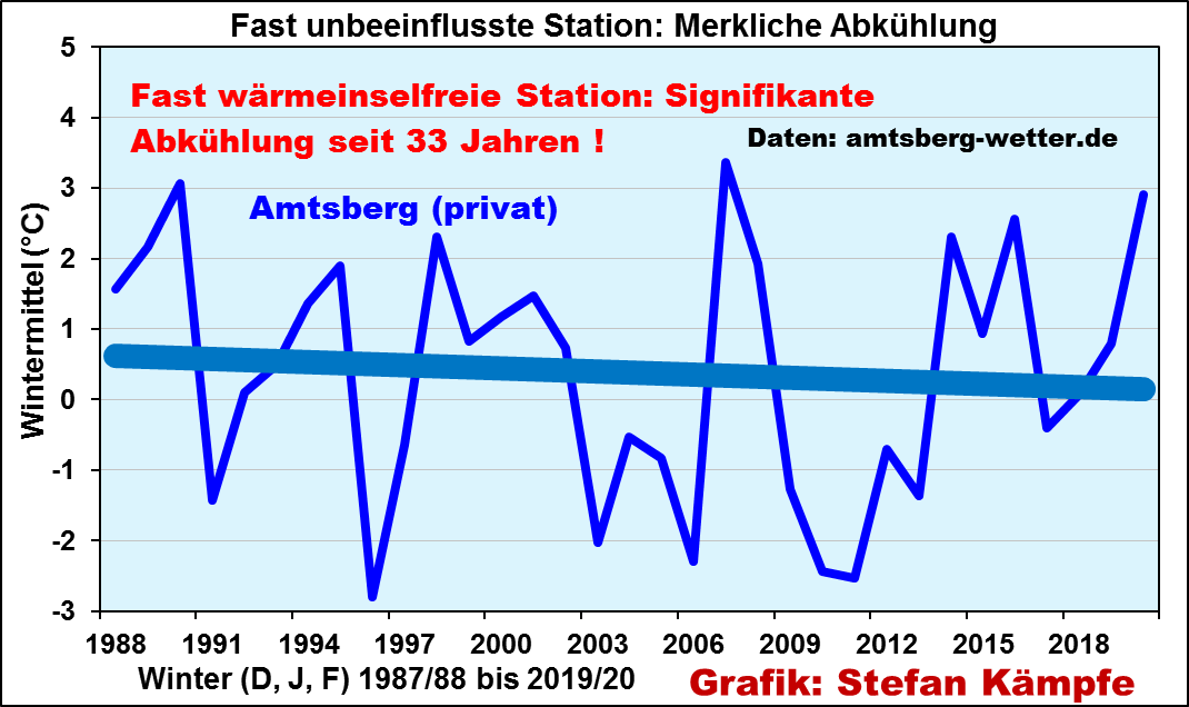 Trotz der sehr milden Winter 2013/14, 2015/16, 2018/19 und 2019/20 sowie kontinuierlich steigender CO2-Konzentration (obere, grüne Linie) stieg das Wintermittel seit 33 Jahren als einziges Jahreszeitenmittel kaum noch, weil die schon erwähnte nachlassende Sonnenaktivität und schwächere Zonalzirkulation bereits Wirkung zeigen. Und die DWD-Daten sind nicht wärmeinselbereinigt. Einen deutlicher fallenden Trend zeigt die wärmeinselarme Station Amtsberg/Erzgebirge: