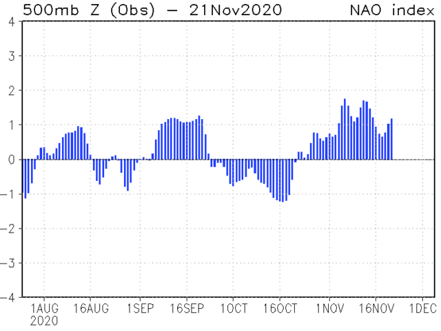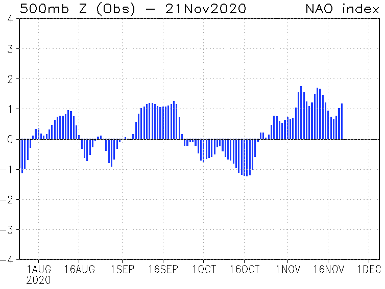 Der NAO-Index ist ein Maß für die Intensität der Westströmung über dem Ostatlantik im Vergleich zum Langjährigen Mittel. Positive NAO-Werte bedeuten häufigere und intensivere, im Winter eher milde Westwetterlagen. Bei negativen NAO-Werten schwächt sich die Intensität der Zonalströmung ab, bei stark negativen Werten kann sie gar in eine Ostströmung umschlagen oder meridional verlaufen. Im Juli und bis Mitte Oktober überwogen negative, danach und im August/September positive NAO-Werte bei merklichen Schwankungen (Quelle):