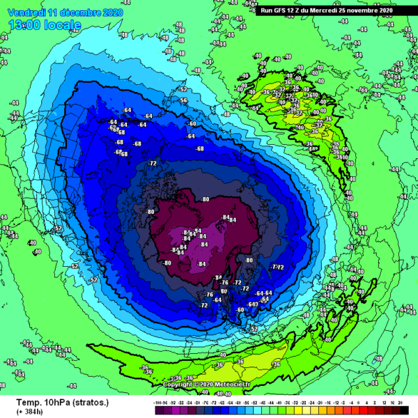 AMO-Warmphasen erhöhen die Wahrscheinlichkeit für einen kalten Winter nur leicht, weil diese Konstellation kalte, nordöstliche Strömungen („Wintermonsun“) begünstigen könnte. Und die sogenannte QBO (Windverhältnisse in der unteren Stratosphäre der Tropen, die etwa alle 2,2 Jahre zwischen West und Ost pendeln), wechselte im Herbst fast in allen Schichten zur Westwind-Phase, was eher für eine Begünstigung der milden Westlagen spricht. In diesem Zusammenhang lohnt noch ein Blick auf die mögliche Entwicklung des Polarwirbels. Ein ungestörter, sehr kalter Polarwirbel im 10-hPa-Niveau (gut 25 Km Höhe, Stratosphäre) ist kreisrund und in der Arktis extrem kalt, was Westwetterlagen begünstigt, welche in Deutschland mild sind. Für den 11. Dezember wird ein Polarwirbel vorhergesagt, der relativ gut entwickelt und nur leicht gestört ist; in seinem Zentrum östlich von Grönland sollen so um die minus 84°C herrschen – leider ein wichtiges Vorzeichen für eher milde Dezember-Witterung in Mitteleuropa (Quelle: Französischer Wetterdienst):