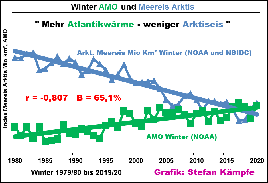 8. Verursacht das angeblich verschwindende Arktische Meereis kältere Winter? Für die relativ kalten Winter 2009/10 und 2012/13 wurde das schwindende arktische Meereis, speziell im September, verantwortlich gemacht. Mit etwa 3,9 Millionen Km² gab es im Septembermittel 2020 nur eine etwas größere Eisfläche, als zum bisherigen Negativ-Rekordmittel von 3,57 Millionen Km² (Sept. 2012) (Daten: NSIDC, National Snow and Ice Data Center der USA). Bei AMO-Warmphasen wird mehr Wärme in die europäische Arktis eingetragen. Die minimale Eisausdehnung und die geringere Westlagenhäufigkeit der 2000er Jahre „passen“ gut zum AMO-Maximum. Genaueres Zahlenmaterial zur Eisausdehnung liegt leider erst seit 1979 vor (Einführung der flächendeckenden, satellitengestützten Überwachung). Zumindest in diesem relativ kurzen Zeitraum von gut 40 Jahren bestand ein signifikanter Zusammenhang zwischen der AMO und der Fläche des winterlichen Arktis-Meereises: