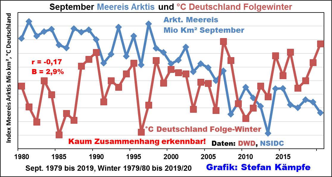 Ähnlich wie in den 1930er Jahren, als während der damaligen AMO-Warmphase ebenfalls ein Meereisrückgang sowie vor allem ein starkes Abschmelzen der Grönland-Gletscher herrschte. Näheres dazu hier. Die These „weniger Arktiseis – mehr Winterkälte in Deutschland“ ist unhaltbar; tatsächlich gibt es nur einen geringen, nicht signifikanten Zusammenhang: