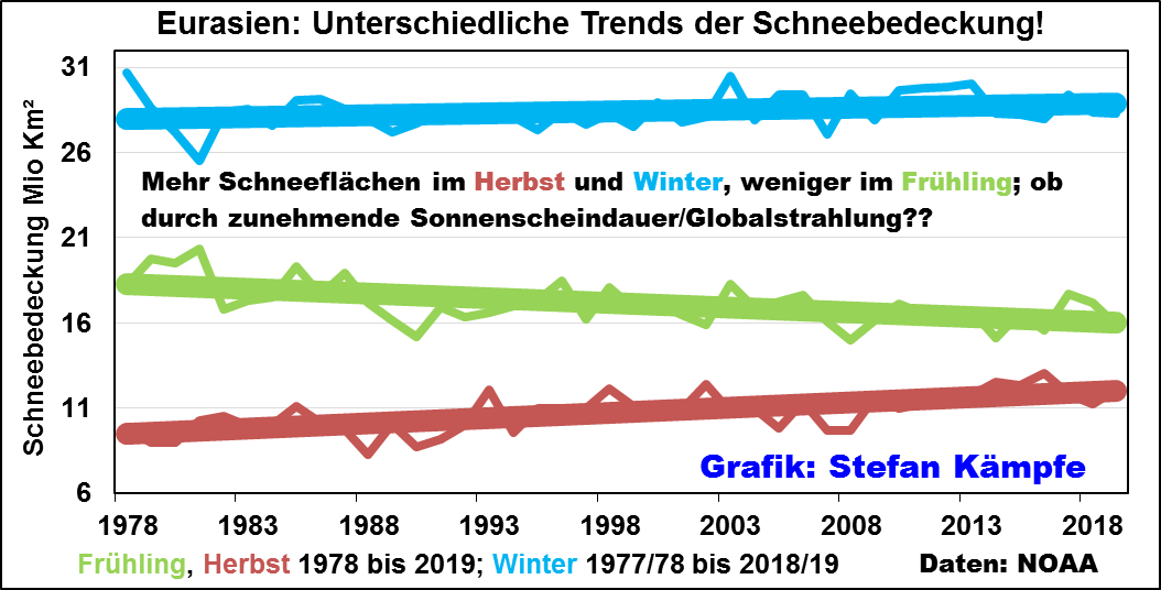 Auch bei Betrachtung anderer Bezugszeiträume besteht keine signifikante Korrelation. Die aktuelle Meereisbedeckung im Vergleich zu den Vorjahren auf der Nordhalbkugel kann man hier abrufen. Laut einer Fehlprognose von Al Gore sollte der Nordpol schon im Spätsommer 2013 eisfrei sein. Näheres hier. Im Herbst 2020 setzte das Eiswachstum relativ spät und erst verhalten, ab Mitte Oktober dann beschleunigt ein, zeitweise gab es weniger Eisflächen, als im Herbst 2012; die starke Eiszunahme im Spätherbst könnte den Temperaturgegensatz zwischen niederen und hohen Breiten aber verstärken und milde Westlagen im Frühwinter begünstigen. Insgesamt hat das komplizierte, wenig erforschte Zusammenspiel zwischen Meeresströmungen, AMO, Meereis und Großwetterlagen wahrscheinlich großen Einfluss auf die Witterungsverhältnisse. Die Ausdehnung der Schneebedeckung im Spätherbst (Okt/Nov) in Eurasien hat ebenfalls keine eindeutigen Auswirkungen auf die deutsche Winterwitterung. So bedeckte der Schnee in den Spätherbsten 1968, 70, 72, 76, 93, 2002, 09, 14,15 und 16 auf der größten zusammenhängenden Landmasse der Erde eine deutlich überdurchschnittliche Fläche, doch nur die 3 Winter 1968/69, 2002/03 und 2009/10 waren danach zu kalt, während die anderen 7 zu mild ausfielen; letztmalig der von 2016/17, trotz des kalten Januars. Eine große Überraschung bot dieser Analyseteil trotzdem. Im Herbst und Winter wächst nämlich die mit Schnee bedeckte Fläche Eurasiens; nur im Frühling und Sommer nimmt sie ab. Sollte es Dank des „Klimawandels“ nicht immer weniger Schneeflächen in allen Jahreszeiten geben?? Und die wahre Ursache für die Abnahme im Frühjahr/Sommer ist nicht das CO2, sondern vermutlich mehr Sonnenschein (siehe folgende Abbildung):