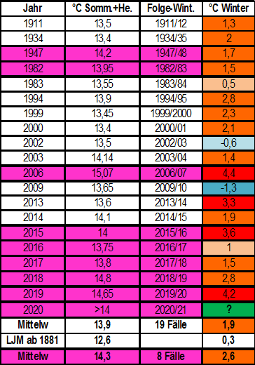 Von den 19 Fällen mit deutlich zu hohem Sommer- und Herbstmittel folgten also nur zwei zu kalte Winter; die übrigen 16 waren allesamt mehr oder weniger deutlich zu mild. Betrachtet man von diesen 19 Fällen nur die 8, bei denen auch der Sommer und der Herbst für sich ihre einfache Temperatur-Standardabweichung erreichten oder überschritten (pink markiert), so waren sogar alle ihnen folgenden Winter zu mild, darunter die extrem milden 2006/07 und 2019/20. Aber der Spätsommer 2020 (August und September) liefert dazu widersprüchliche Hinweise. Er stellte nach der Objektiven Wetterlagen-Klassifikation des DWD (seit 1979 verfügbar) mit 31 Tagen einen neuen Häufigkeitsrekord der Unbestimmten Wetterlagen (solche ohne eindeutige Anströmrichtung, als XX-Lagen bezeichnet) auf. Ähnlichen Spätsommern folgten in der Vergangenheit tendenziell kalte Frühwinter; zum Februar besteht keinerlei Zusammenhang: