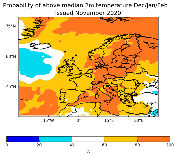 Anmerkung: Hier wird nur die Metoffice- Karte mit der Wahrscheinlichkeit des Abweichens vom Median gezeigt. Es gibt zwei weitere. Diese Median-bezogene Wahrscheinlichkeitsaussage zeigt, wie die anderen Karten auch, eine sehr stark erhöhte Wahrscheinlichkeit für über dem Median liegende Wintertemperaturen besonders in Mittel- und Nordosteuropa sowie über dem Eismeer und Teilen des Mittelmeeres:
