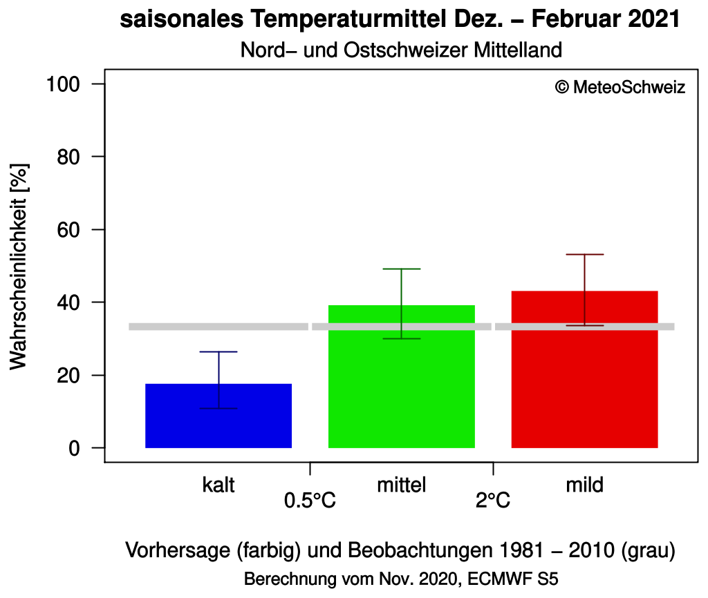 Meteo Schweiz Stand Nov. 2020: Je leicht erhöhte Wahrscheinlichkeit für einen normalen und einen zu milden Winter. Zusammen ergibt das eine Wahrscheinlichkeit von gut 80% für „normal“ bis „zu mild.“ Zu kalter Winter zu kaum 20% wahrscheinlich; normaler zu etwa 40%, milder etwas mehr. Die „doppelten T“ sind die Fehlerbalken; die Prognose gilt nur für die Nordostschweiz, ist aber auch für Süddeutschland repräsentativ: