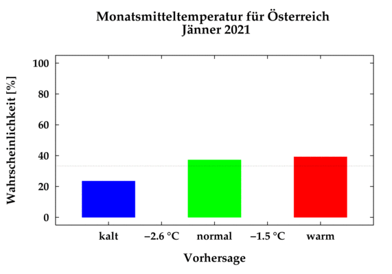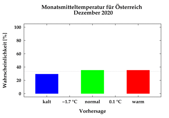 ZAMG (Wetterdienst Österreichs) Stand Nov. 2020: Dezember mit je ganz leicht erhöhter Wahrscheinlichkeit normal oder mild; immerhin noch gut 25% Wahrscheinlichkeit für einen kalten Dezember. Im Januar 2021 erhöht sich die Wahrscheinlichkeit für „normal“ oder „zu mild“ etwas; für Februar lag noch keine Aussage vor (Prognose hier)