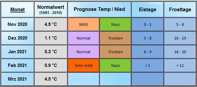 LARS THIEME (langfristwetter.com) Vorhersage von Anfang November 2020: Dezember und Januar normal, Februar sehr mild. Winter daher insgesamt eher zu mild. Die Prognose bezieht sich vorrangig auf Mittel- und Nordostdeutschland; leider diesmal ohne „von-bis-Temperaturintervalle“ für die einzelnen Monate: