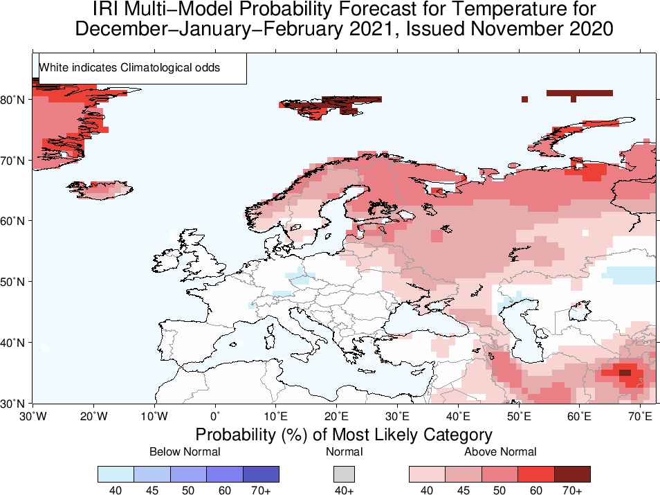 IRI (folgende Abbildung), Vorhersage vom Nov. 2020: Kaum Aussagen für Deutschland; lediglich in Südost-Sachsen und Süd-Bayern leicht erhöhte Wahrscheinlichkeit für einen zu kalten Winter; zu mild in weiten Teilen Nord- und Osteuropas: