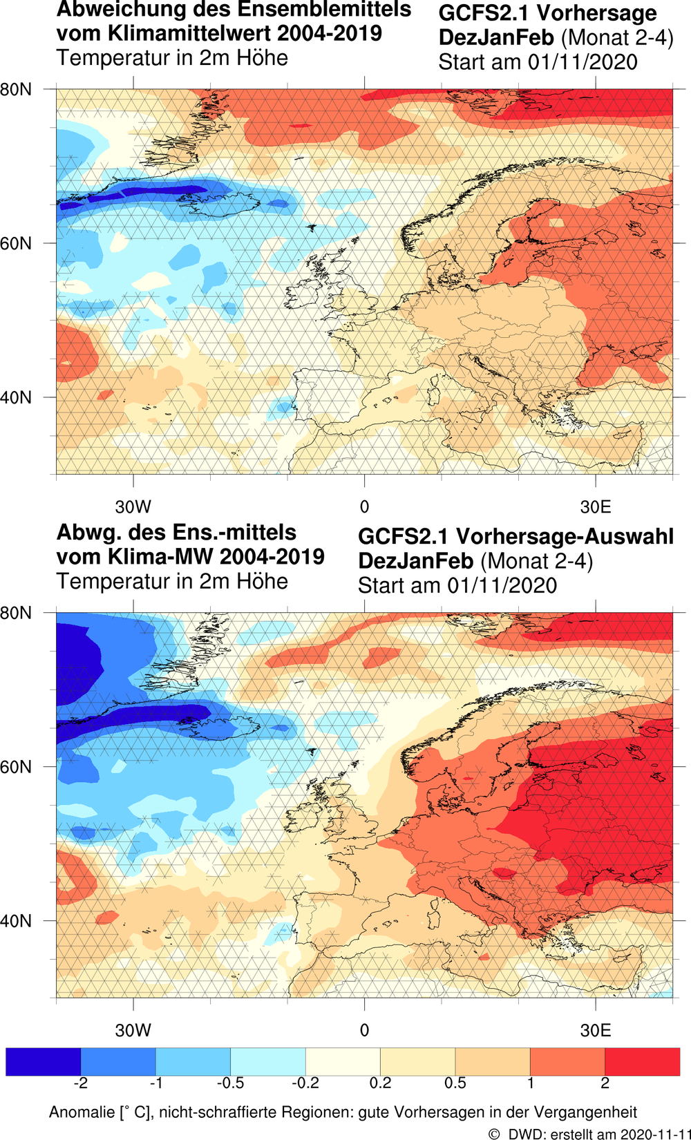 DWD (Offenbach): In Deutschland 0,5 bis 2°C zu mild, je nach Ensemble-Auswahl, bezogen auf den DWD-Mittelwert der Jahre 2004 bis 2019, der ca. 1,4°C beträgt (Stand 11. Nov. 2020):