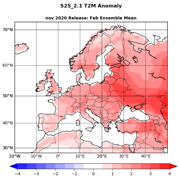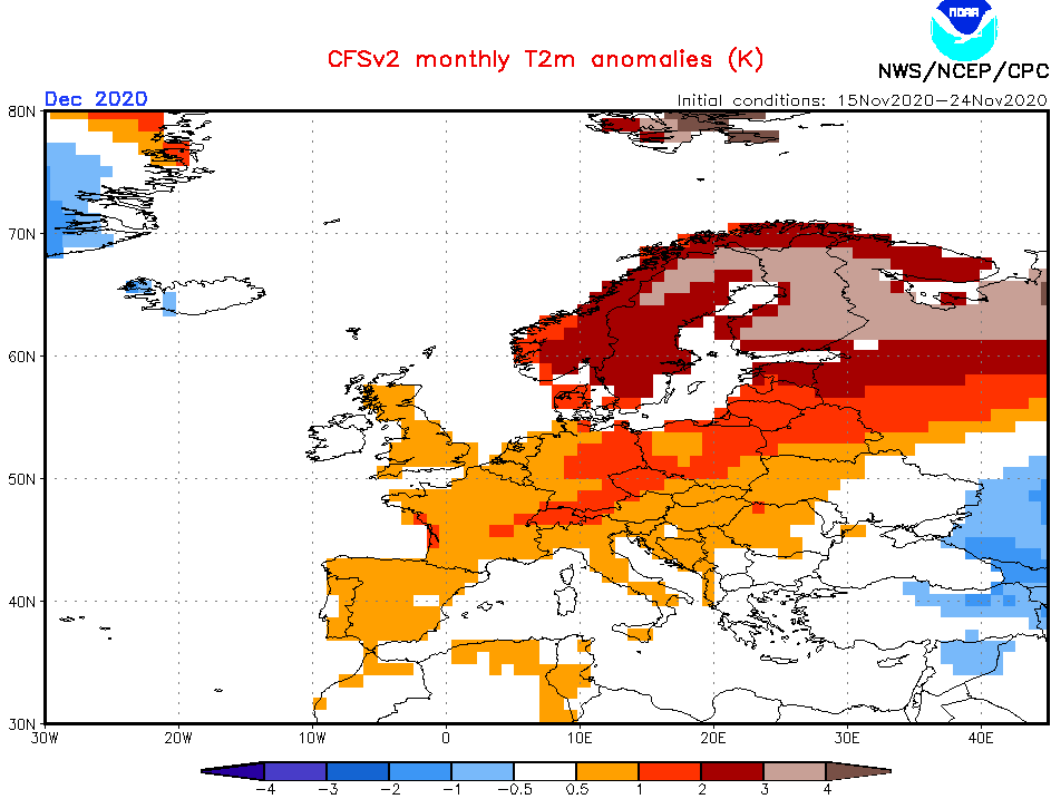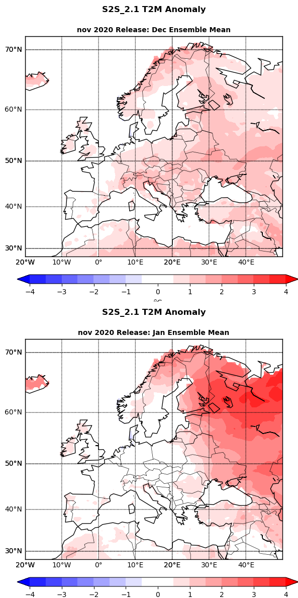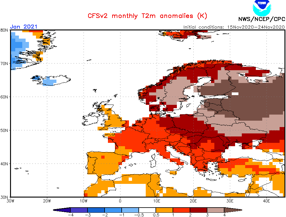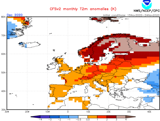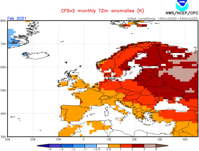 CFSv2- Modell des NOAA (Wetterdienst der USA, folgende 3 Abbildungen, Eingabezeitraum 14. bis 24.11. 2020): Winter insgesamt etwa 1 bis 2 K zu mild. Dezember (oben) 0,5 bis 2 K, Januar (Mitte) 1 bis 3 K, Februar (unten) 0,5 bis 2 K zu mild. Die vorhergesagten Temperaturabweichungen beziehen sich auf die Mittelwerte der Periode 1981 bis 2010. Bemerkenswert ist, dass der Mildwinter von diesem Modell schon seit dem Sommer 2020 nahezu durchgängig vorhergesagt wird. Diese experimentellen, fast täglich aktualisierten, aber unsicheren Prognosen unter http://www.cpc.ncep.noaa.gov/products/people/wwang/cfsv2fcst/ (Europe T2m, ganz unten in der Menütabelle; E3 ist der aktuellste Eingabezeitraum):