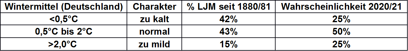 Fazit: Eindeutige, verlässliche Anzeichen für einen Winter in die extrem kalte Richtung fehlen; für die extrem milde Richtung gibt es nur ganz wenige Signale. Die Prognosesignale waren selten so widersprüchlich und instabil; lassen aber Raum für mehr Kälte. Die Vorhersagen der Wetterdienste und Institute tendieren jedoch bei extrem großer Unsicherheit in Richtung eines normalen bis sehr milden Winters. Allerdings verdichten sich die Anzeichen für einen kälteren Dezember als in den Vorjahren, weil unter anderem zumindest anfangs die Westdrift blockiert und geschwächt ist. Insgesamt fällt der Winter 2020/21 nach momentanem Stand also bei enormer Unsicherheit fast normal aus und wird im Deutschland-Mittel auf minus 1,0 bis +3,0°C geschätzt (LJM 1991 bis 2020 +1,4°C). In den Kategorien „zu kalt“, „normal“ und „zu mild“ stellen sich die Wahrscheinlichkeiten des Winters 2020/21 folgendermaßen dar: