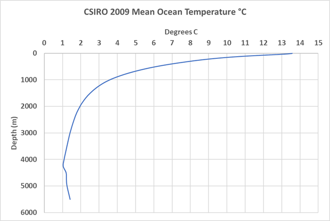Abbildung 1: CSIRO 2009 globale Durchschnittstemperatur von der Oberfläche bis 5.500 Meter. Datenquelle: CSIRO.