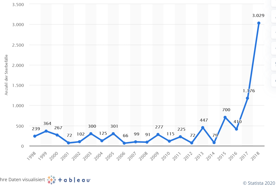 Bild 3 Statista: Anzahl der Sterbefälle infolge von Grippe in Deutschland in den Jahren 1998 bis 2018