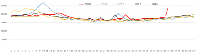 Bild 3a Wöchentliche Sterbefallzahlen Deutschland incl. KW44 mit den Einzeljahren. Grafik vom Autor erstellt. Datenquelle: Statistisches Bundesamt