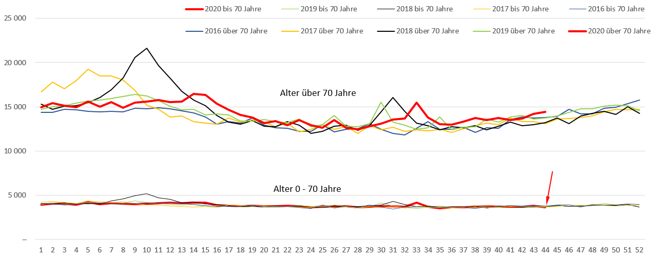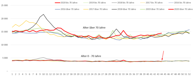 Bild 4 Wöchentliche Sterbefallzahlen Deutschland incl. KW44 mit den Einzeljahren, aufgeteilt in Alter bis 70 und Alter über 70 Jahre. Grafik vom Autor erstellt. Datenquelle: Statistisches Bundesamt
