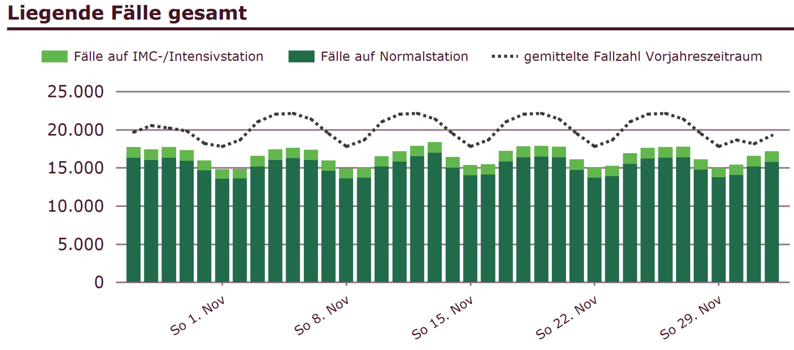 Bild 8 Helios-Kliniken: Auslastung November im Vergleich zum Vorjahr. Man sieht schön, wie die Patienten zu jedem Wochenende „ausgekehrt“ werden