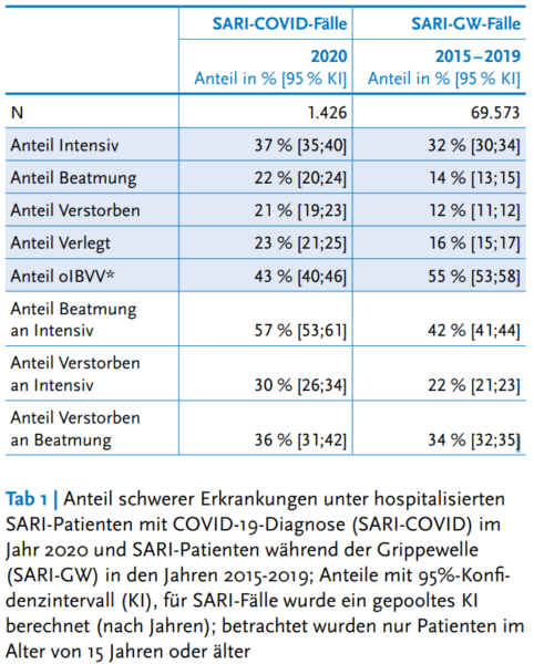 Nun noch ein Überblick, wie nahe Covid-19 und Influenza in ihren Auswirkungen beieinander liegen. Vor allem der Anteil benötigter Intensivbetten liegt mit 37/32 % und beatmet 57/42 % nicht weit auseinander. Da selbst die gegenüber früheren wirklichen Grippejahren noch moderat mortalen Grippejahre der vergangenen vier Jahre weit höhere Fallzahlen als bisher Corona hatten, müsste ein konsequentes Weiterführen der politisch verordneten „Sterbeverhinderung“ alle zwei – vier Jahre zu einem Lockdown und erneuten Zerstörung von Wirtschaft und öffentlichem Leben führen.