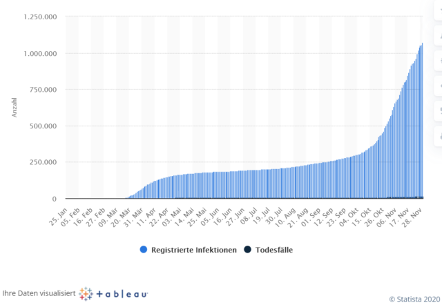 Bild 10 Stand 30.11. (kumuliert): Anzahl registrierte Covid-19-Infektionen (Fallzahlen) 1.071.345 und Todesfälle 16.694 (1,56 %)