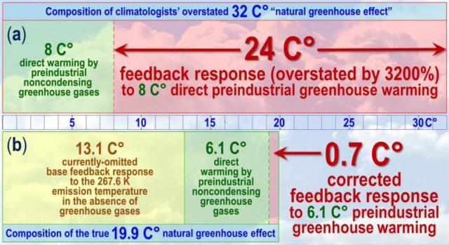 Das Team korrigierte diesen Fehler und berechnete, dass man die 6,1 °C direkte Erwärmung durch die vorindustriellen, nicht kondensierenden Treibhausgase nicht mit einem Systemgewinnfaktor von 32 / 8 oder 4 multiplizieren sollte, wie es Klimawissenschaftler tun. Stattdessen sollte man sie mit einem Systemverstärkungsfaktor von 6,8 / 6,1 oder nur mit 1,11 multiplizieren. Da sich die Erwärmung mit zunehmender Oberflächentemperatur ein wenig beschleunigt, wird aus dem Faktor 1,11 heute etwa 1,19.