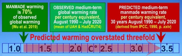 IPCC (1990, S. xxiv) hatte zuversichtlich eine mittelfristige, vom Menschen verursachte Erwärmung von 3,4 °C pro Jahrhundert vorhergesagt. Die gemessene vom Menschen verursachte globale Erwärmung von 1990-2020 entsprach jedoch nur 1,15 °C pro Jahrhundert (Abb. 2).