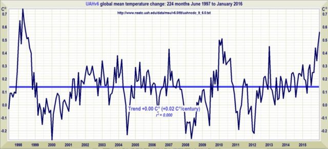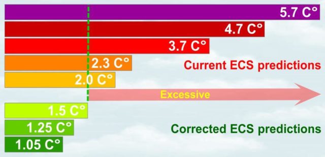 Ungeachtet einer ähnlich geringen Erwärmung, die in Lewis & Curry und vielen anderen Arbeiten (z.B, Lindzen & Choi 2011; Aldrin et al. 2012; Otto et al. 2013; Akasofu 2013; Spencer & Braswell 2014; Skeie et al. 2014; Soon et al. 2015; Bates 2016), haben die Klimaforscher ihre Vorhersagen von etwa 4 °C Enderwärmung als Reaktion auf die Verdoppelung des CO2-Gehalts in der Luft nicht reduziert, um die Reduktion zu erreichen, zu der sie die langsame Erwärmung der realen Welt in ihren mittelfristigen Vorhersagen der vom Menschen verursachten globalen Erwärmung gezwungen hatte.