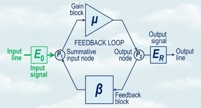 Abbildung 5: Blockdiagramm des Rückkopplungsverstärkers (Bode, 1945), welches das Eingangssignal E0 (in Klima, Emissionstemperatur) zeigt, das die Klimawissenschaftler übersehen hatten, wodurch versehentlich die solare Rückkopplung zur Rückkopplung der direkten Erwärmung durch vorindustrielle, nicht kondensierende Treibhausgase addiert wurde.